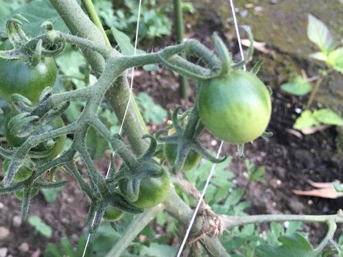 ご訪問ありがとうございます。 夏本番です。あっという間に地面が乾き始めました。 一カ月ほど前にご近所の方からいただいた 10cmほどのミニトマトの苗(摘心を挿したらついたそうです)が、 あっという間に生っていました。 (保護色すぎて気付かなかった…